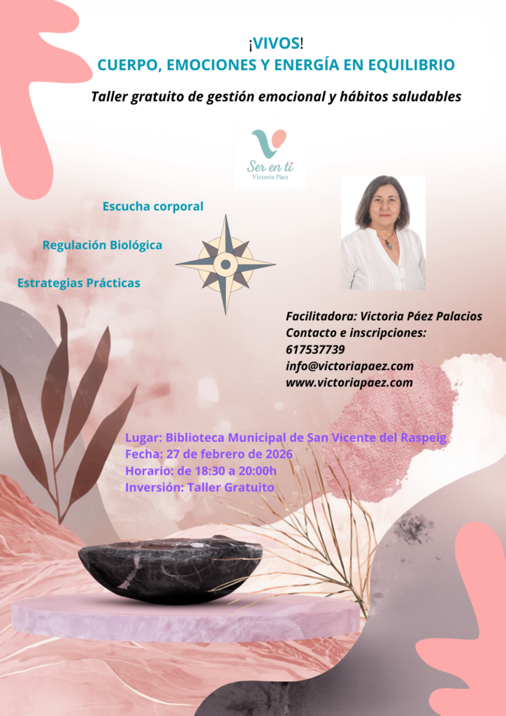 El próximo viernes 27 de febrero a las 18:30h, tendrá lugar en la Biblioteca Municipal «Miguel Delibes» el taller gratuito de gestión emocional y hábitos saludables: «¡Vivos! Cuerpo, emociones y energía en equilibrio» a cargo de Victoria Páez Palacios.